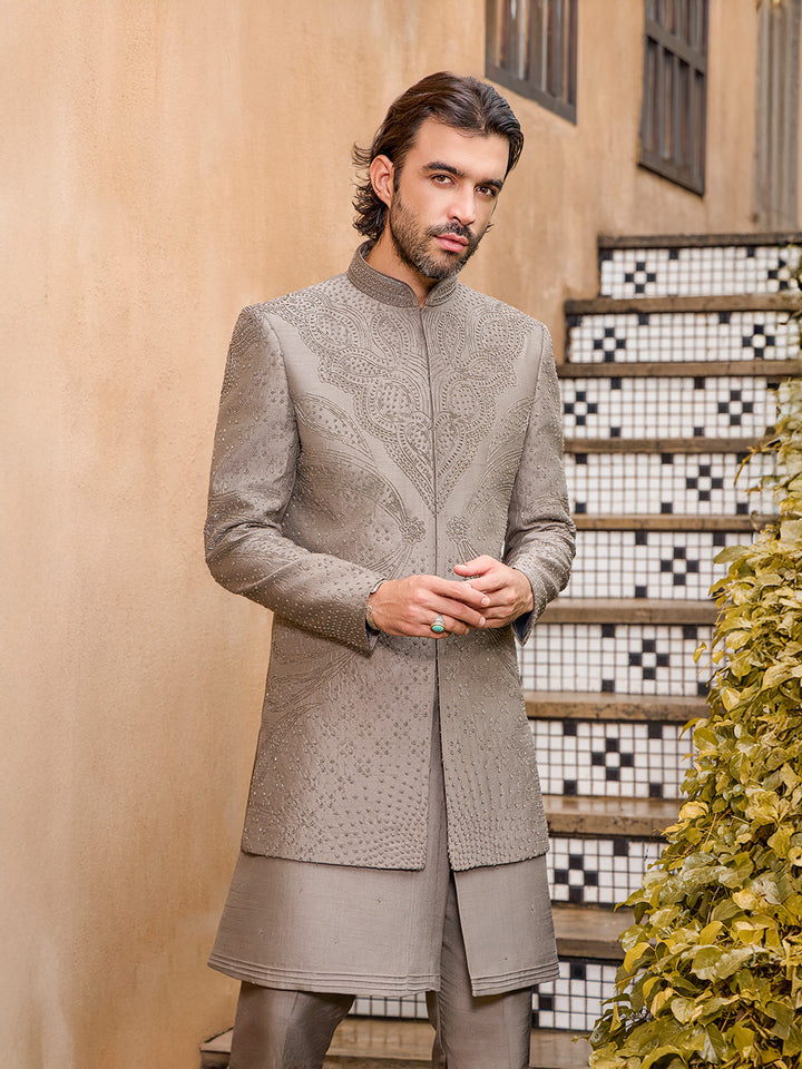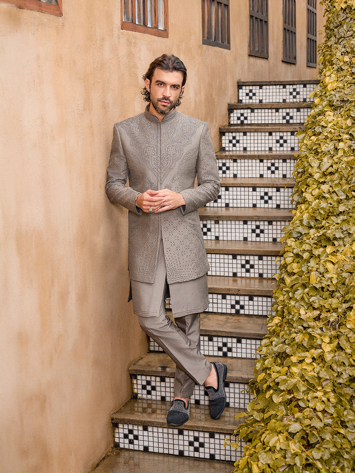 The Ash Majesty Textured Indo-Western is a refined blend of modern minimalism and regal detail. Designed in a sophisticated ash-grey palette, the jacket features intricate geometric and mandala-inspired embroidery that adds architecture-like depth to the silhouette. The front-open style with a layered inner kurta creates a structured, contemporary look, while the mandarin collar enhances its royal presence. Paired with tonal trousers, this ensemble is crafted for men who prefer understated luxury with impeccable craftsmanship.