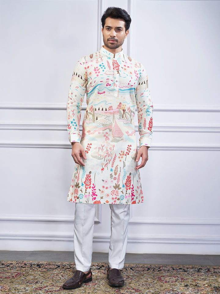Embrace easygoing charm with this Boho Pastel Printed Off-White Kurta for Men.