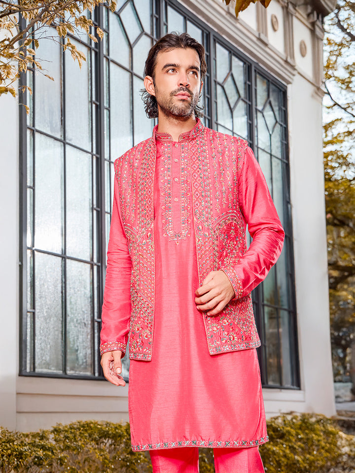 The embroidered jacket, adorned with intricate geometric and floral detailing, adds depth and richness, while the matching kurta enhances the monochrome charm. Subtle embellishments along the neckline, hem, and cuffs bring in a refined sparkle, making this set a perfect choice for haldi, mehendi, daytime weddings, or any celebration where color takes center stage.