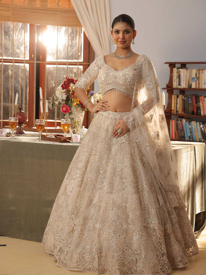 - A beautiful lehenga in a soft, light peach or nude color, featuring delicate floral embroidery scattered across the full skirt in light green and gold threads.