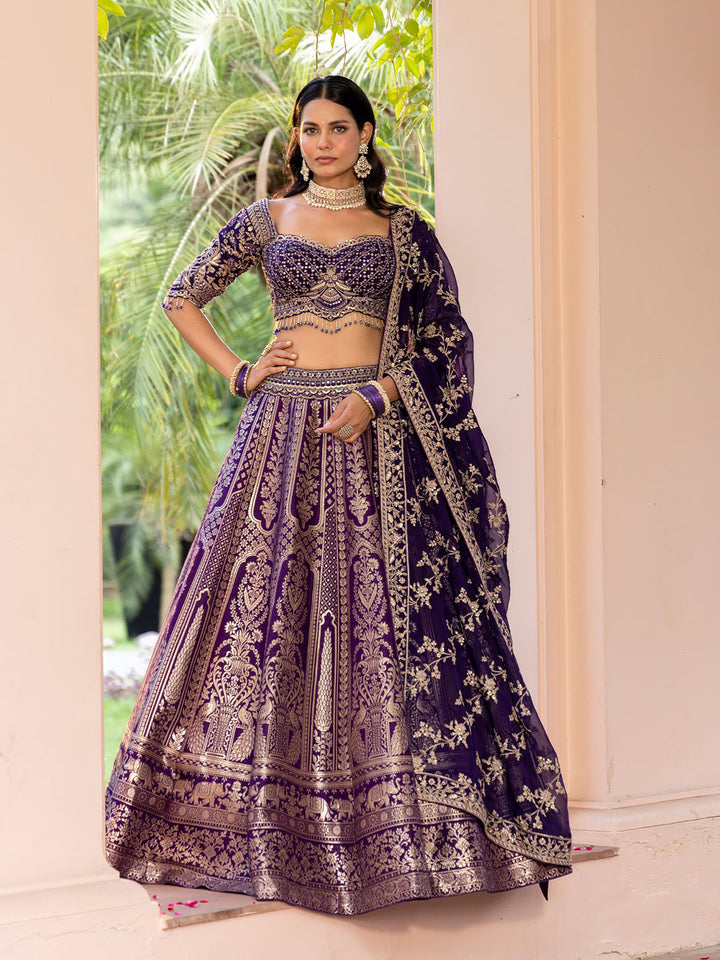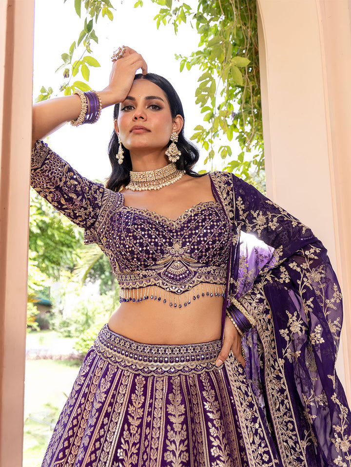 - This eye-catching lehenga presents a striking color combination of deep violet in the skirt and an ornate overlay or heavy embroidery on the blouse.