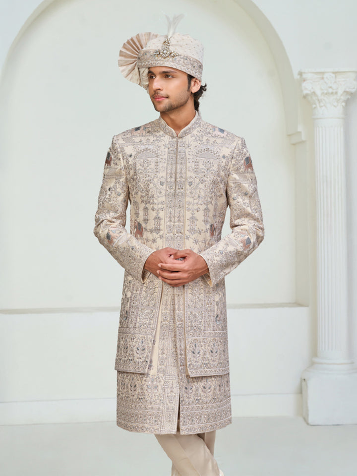 Paired with a coordinating turban, the set creates a cohesive and elegant groom's look. Crafted from a premium soft fabric, the sherwani ensures a comfortable fit throughout the celebration while maintaining a structured and refined silhouette.