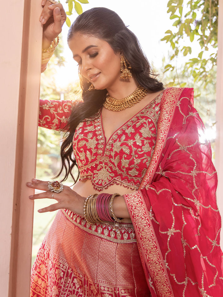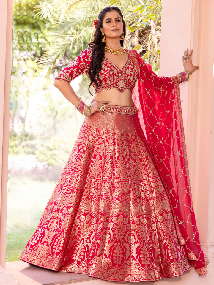 - A warm and radiant lehenga set featuring a skirt dominated by fiery mandarin orange and bright pink shades in a traditional brocade style.