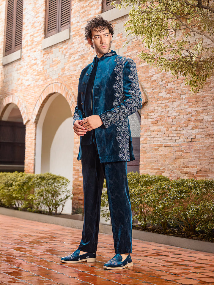 The deep, lustrous fabric enhances the outfit’s opulence, while the clean Indo-Western structure keeps it modern and wearable. Paired with matching velvet trousers and coordinated footwear, this ensemble is a standout choice for receptions, sangeet nights, winter weddings, or any grand celebration where elegance needs a bold companion.