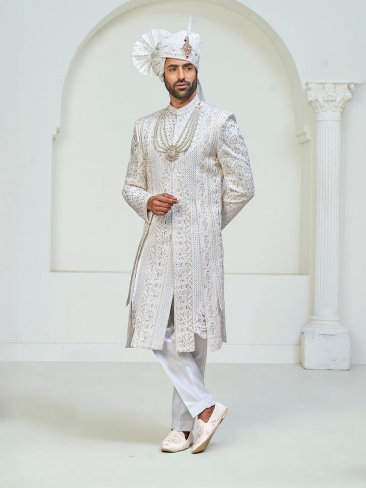 Ivory Hand-Embroidered Groom Sherwani with Dupatta & Turban