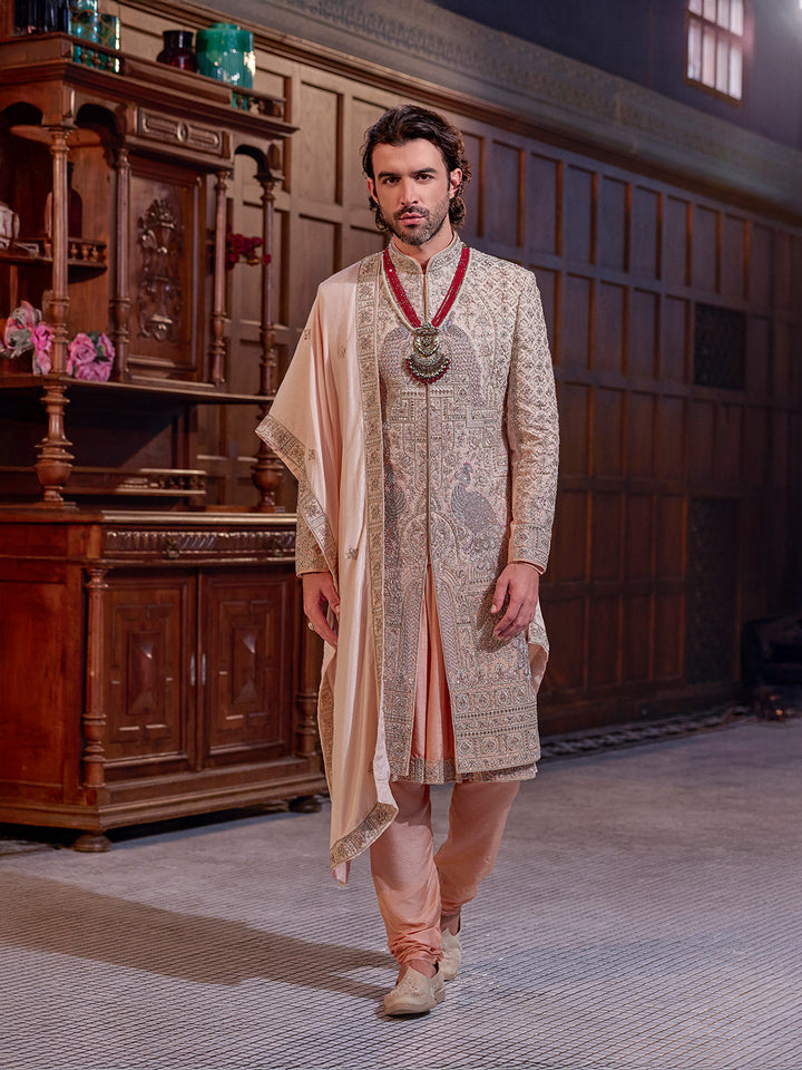 The Ivory Heritage Hand-Embroidered Sherwani is a masterpiece crafted for the modern groom who values tradition wrapped in luxury. Designed in a serene ivory palette, the sherwani showcases intricate all-over thread and zari embroidery inspired by classic Indian artistry. The rich detailing on the sleeves, front placket, and hem brings a regal depth to the ensemble. Paired with a soft drape and peach-toned churidar, the outfit exudes elegance and grandeur—perfect for wedding pheras, royal-themed celebrations, and high-profile festive occasions.