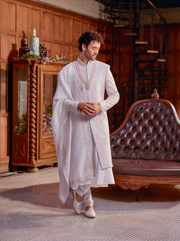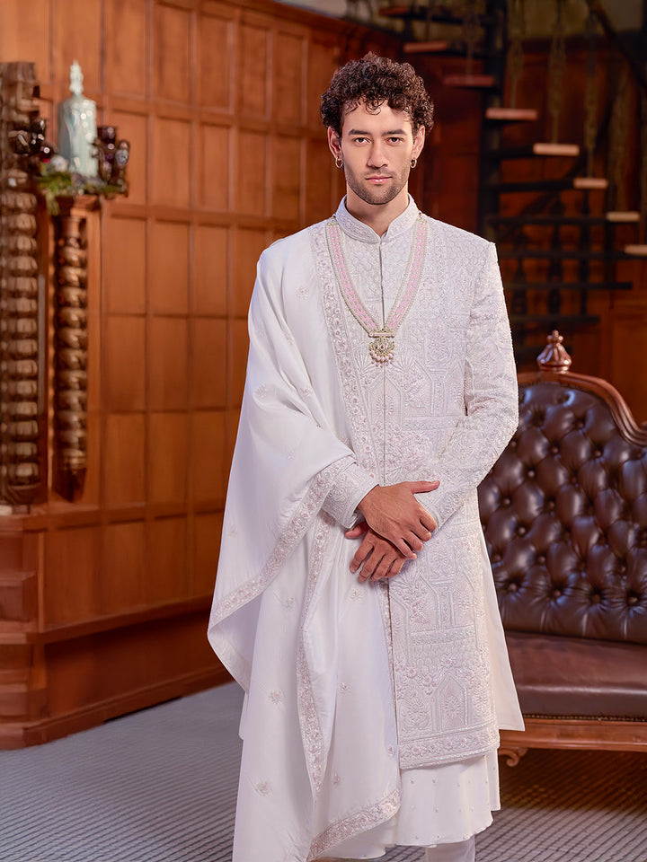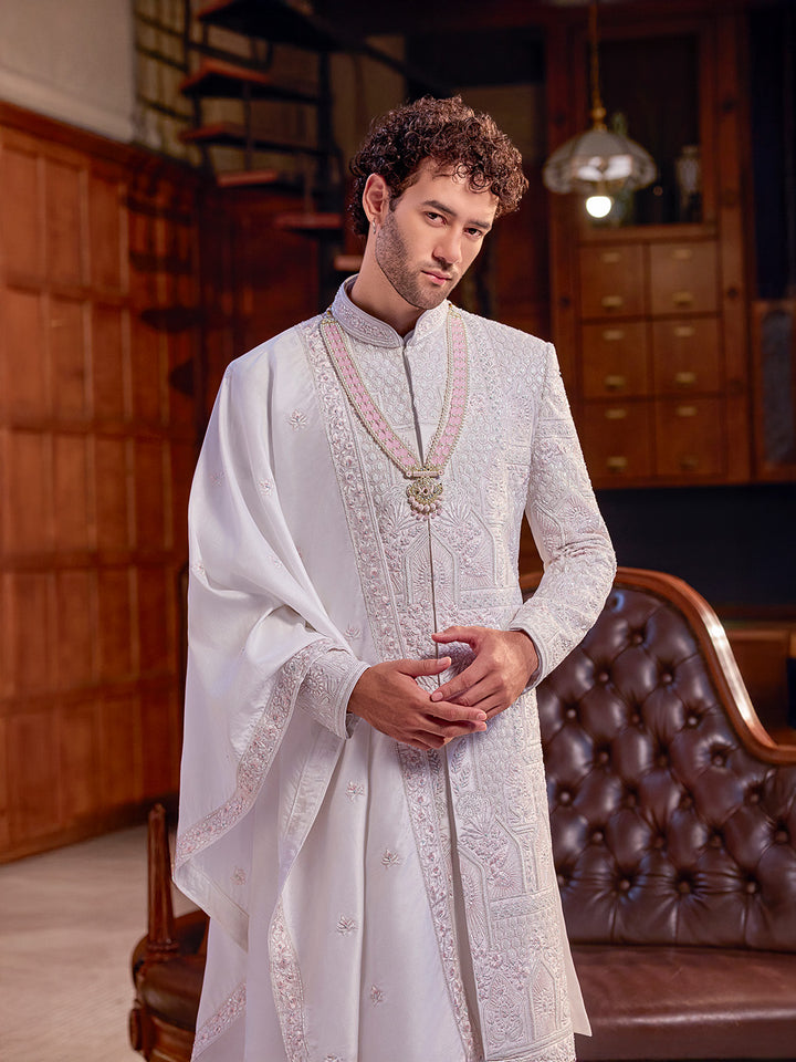 The Ivory Majesty Hand-Embroidered Sherwani is a breathtaking statement piece crafted for grooms who want an aura of grandeur wrapped in subtle sophistication. Designed in a pristine ivory palette, this sherwani stands out with its intricate tonal embroidery, blending traditional artistry with modern finesse.