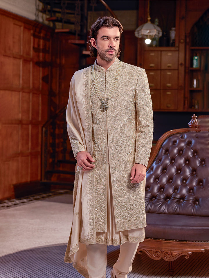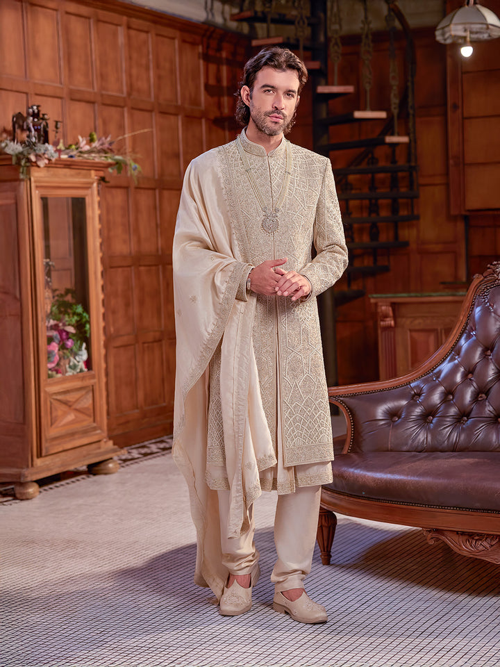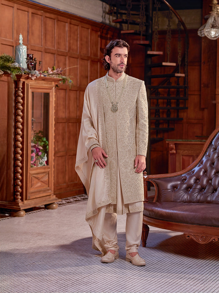 Draped in a luxurious ivory tone, this ensemble radiates quiet opulence. Sherwani becomes the highlight of the look, featuring intricate all-over thread embroidery that showcases artisanal precision and royal detailing. Its structured silhouette paired with a classic mandarin collar adds an air of authority and elegance.