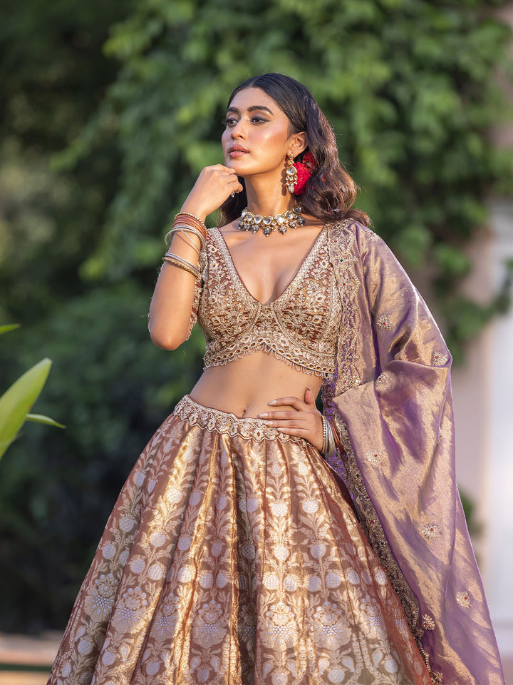 - This exquisite lehenga is a symphony of rose gold, soft pink, and pale grey, expertly woven together to create a luxurious brocade effect across the voluminous skirt.