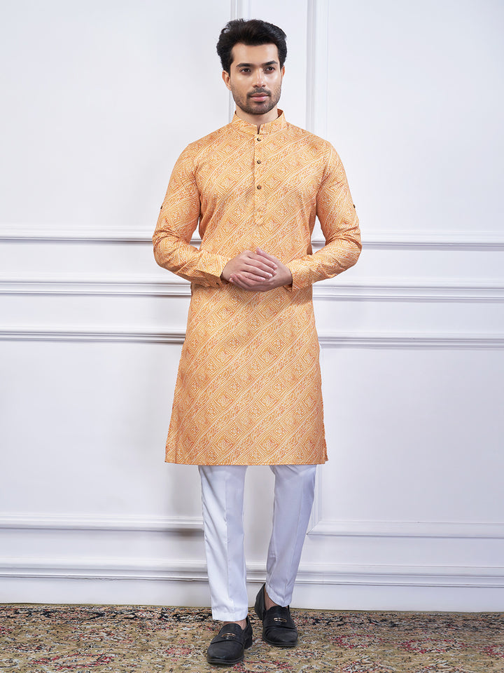Brighten up your ethnic wardrobe with this Mango Yellow Bandhani Printed Kurta for Men.