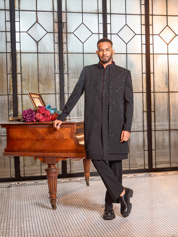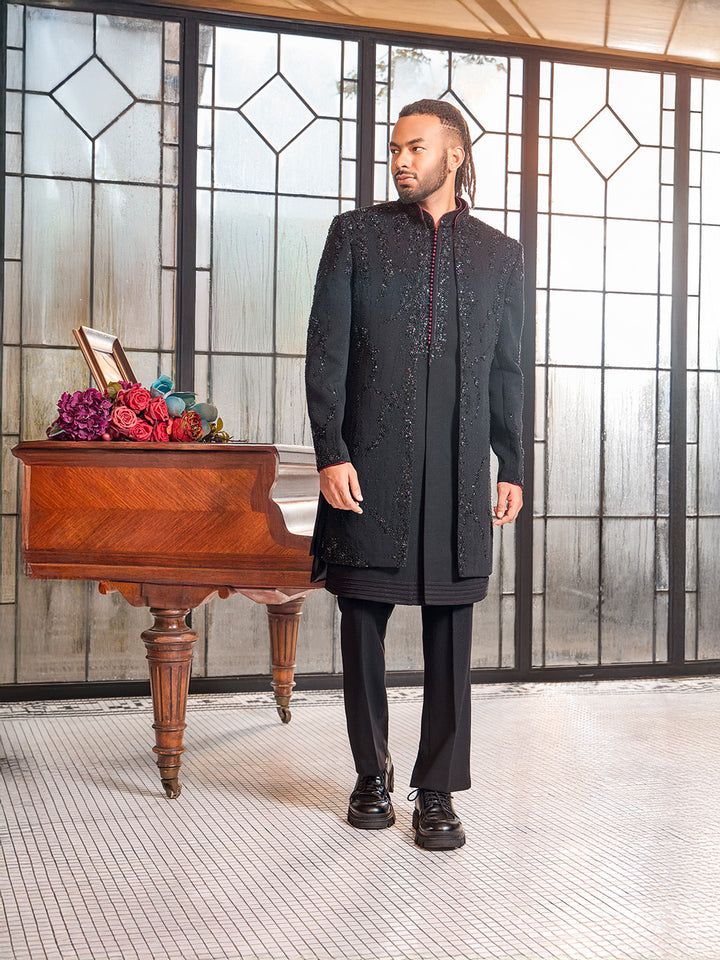The Midnight Luxe Sequin Indo-Western is a striking blend of contemporary elegance and subtle opulence. Draped in deep black, the coat features intricate tonal sequin embellishments that create a refined shimmer without overpowering the silhouette. The mandarin collar with a hint of contrasting piping adds a sharp, modern edge, while the long layered inner panel enhances depth and structure. Paired with tailored trousers, this ensemble exudes confidence—perfect for receptions, cocktail nights, and premium evening events.