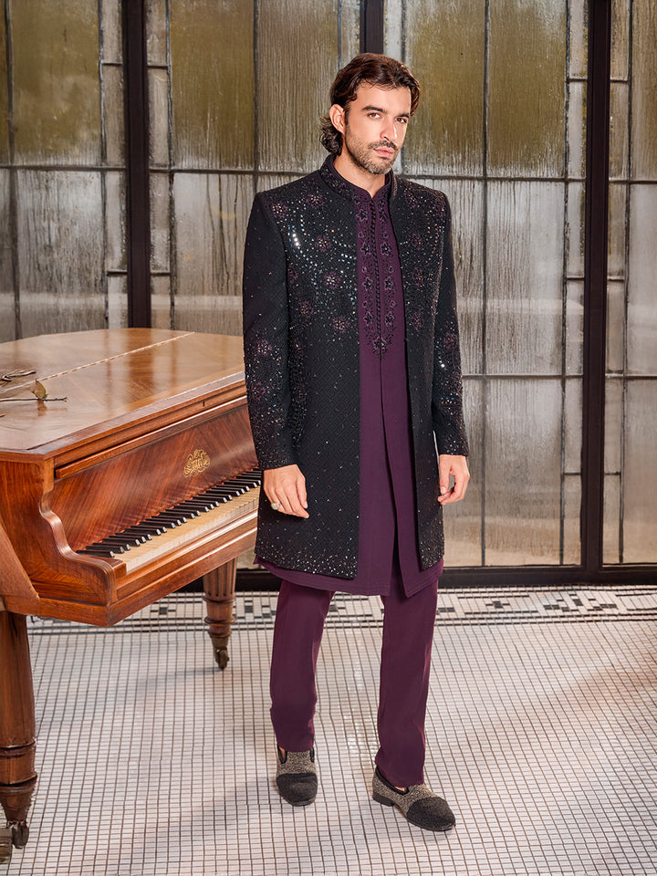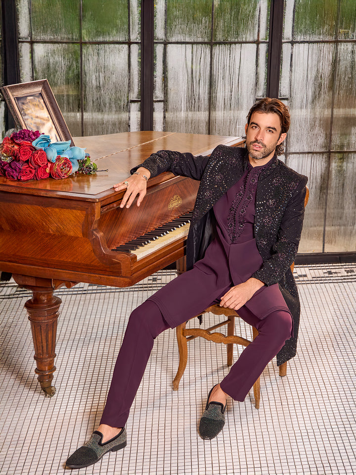 The Noir Plum Sequin-Embellished Indo-Western brings together dramatic elegance and modern luxury. The black coat is adorned with intricate tonal sequins and textured embroidery, creating a subtle shimmer that elevates its regal presence. Beneath the jacket lies a rich plum inner layer that adds a bold, sophisticated contrast. The mandarin collar and structured silhouette enhance the outfit’s contemporary appeal, making it the perfect choice for evening galas, receptions, and high-end celebrations.