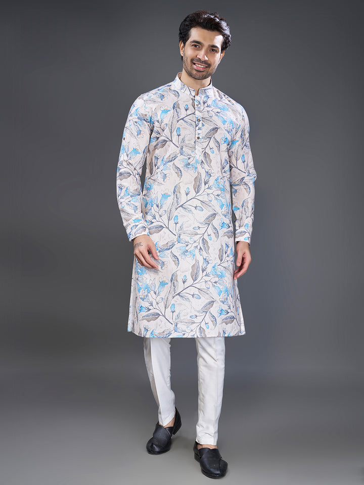 Bring classic charm with a modern twist to your wardrobe with this Off White and Blue Floral Kurta.
