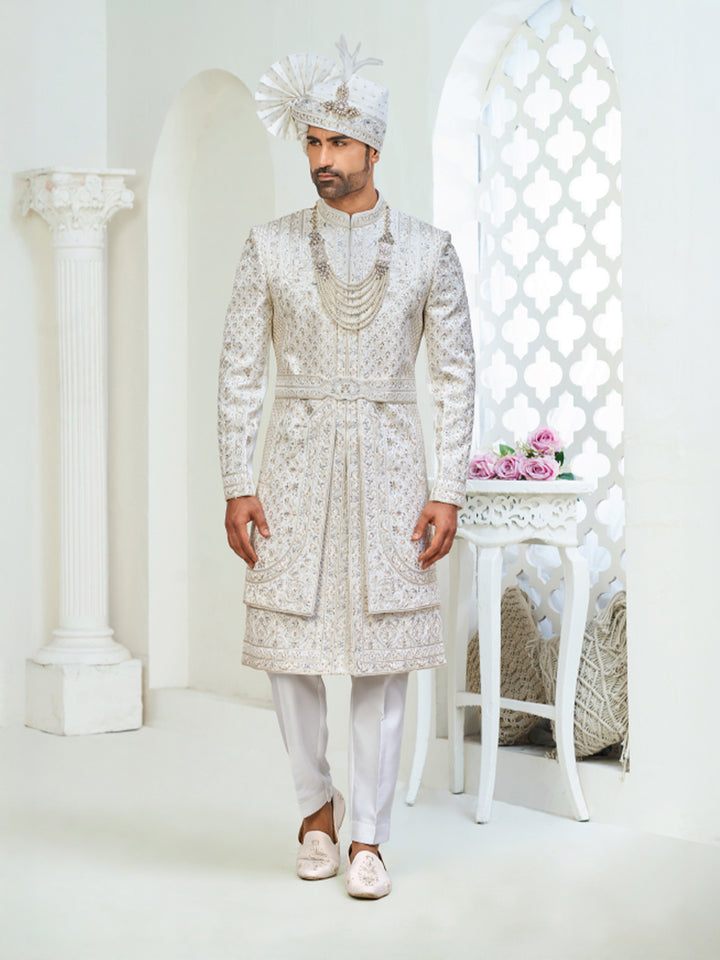 Make a grand statement on your special day with our Designer Double Pattern Embroidered Sherwani, crafted to embody grace, luxury, and regal sophistication. The unique dual-pattern embroidery adds dimension and character to the sherwani, blending traditional craftsmanship with modern elegance.