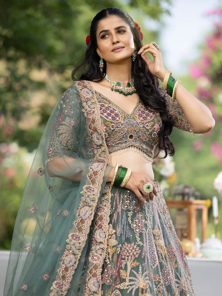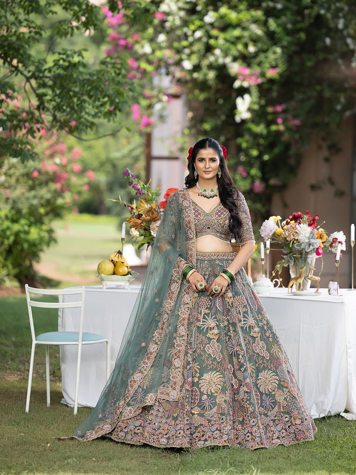 - This captivating lehenga set features a rich sage green fabric base, heavily adorned with multi-colored thread work that evokes a vibrant garden theme.
