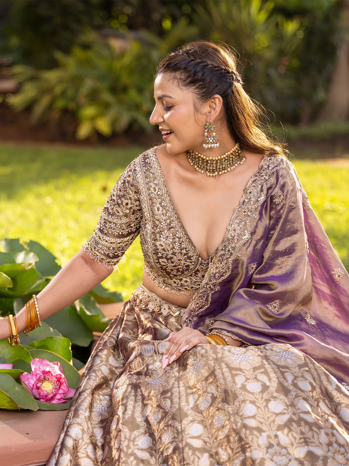 - A captivating lehenga featuring a rich, textured fabric woven with mauve pink, deep grey, and gold threads, creating a luxurious and complex pattern.
