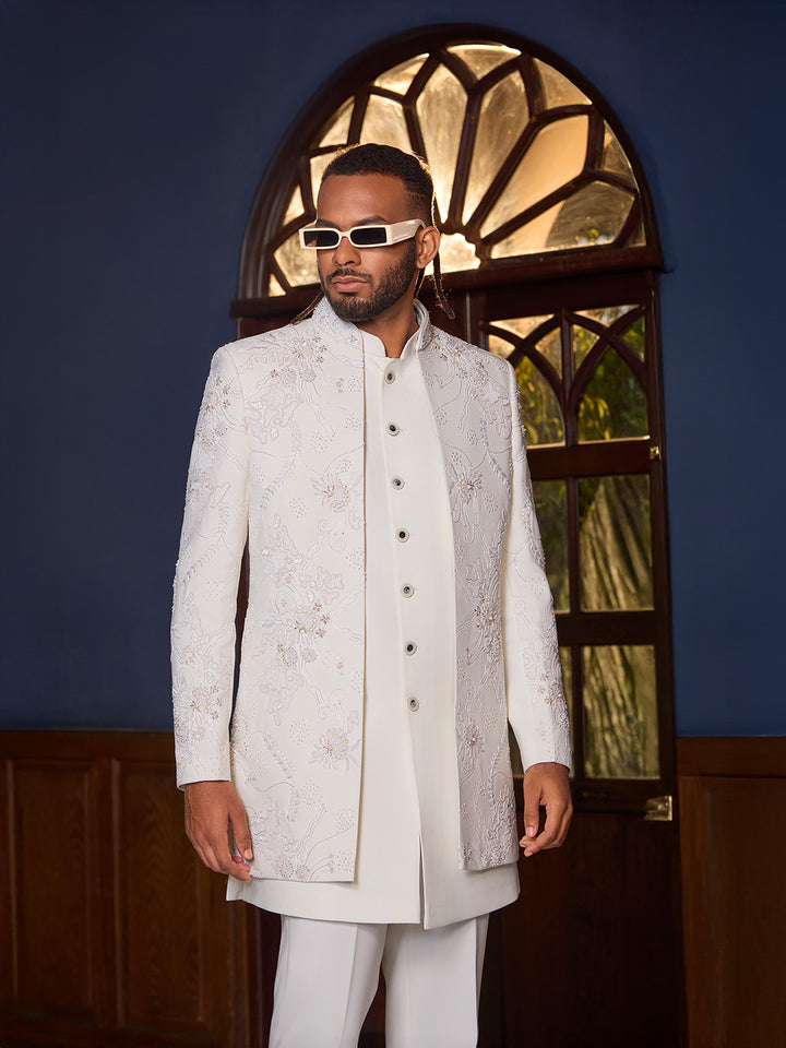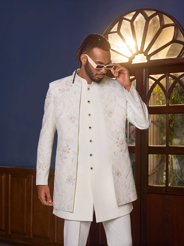 The structured Indo-Western silhouette, paired with a sleek layered kurta and straight pants, delivers a contemporary, fashion-forward profile perfect for engagements, receptions, and upscale celebrations. A statement piece for the man who likes his style polished, minimal, and effortlessly commanding.
