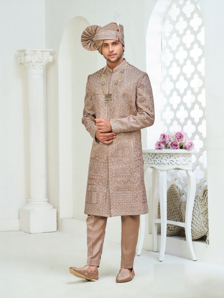 Step into your special day with unmatched class in our Golden Brown Luxury Sherwani, crafted especially for the modern groom who values tradition and elegance. The rich golden-brown shade brings a royal warmth, while the refined embroidery adds a touch of opulence.