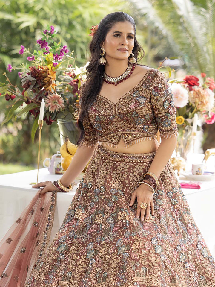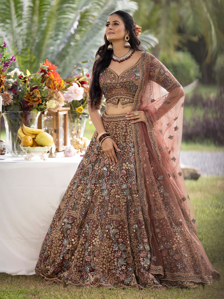 Rich Mocha Brown Multi-Colour Floral Lehenga