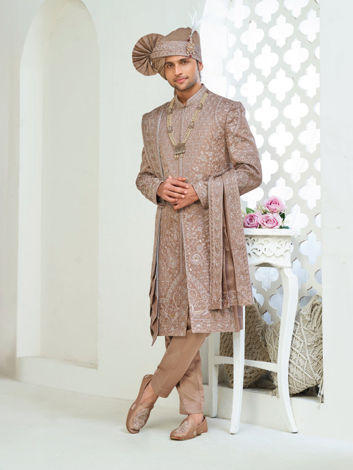 Make a statement on your wedding day with our Royal Golden Brown Wedding Sherwani Set . Crafted with attention to detail, this sherwani features intricate hand embroidery on premium fabric, perfectly blending traditional Indian design with modern elegance. Ideal for weddings, receptions, or festive celebrations, it ensures you look stylish, sophisticated, and regal. Complete your ensemble with a matching churidar or pyjama.