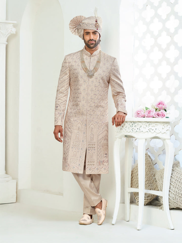 Soft Peach Hand-Embroidered Sherwani for Wedding Ceremonies