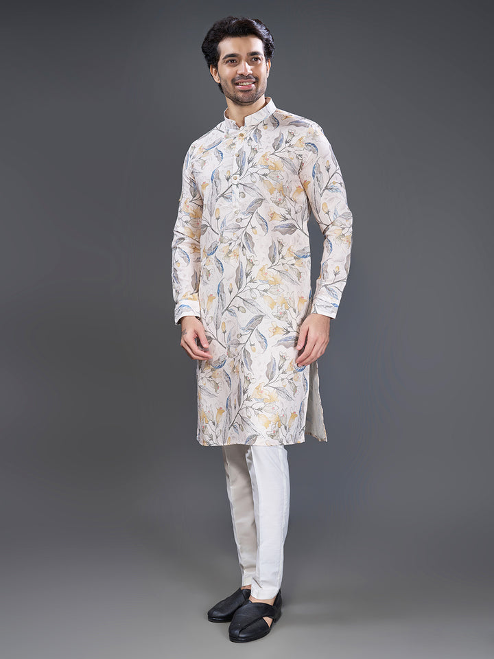 Title: Yellow and grey printed off white kurta for men